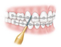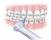 Optimal nutzen Sie dazu eine elektrische Zahnbürste, da diese die bakteriellen Beläge zuverlässiger entfernt als eine Handzahnbürste. Reinigen Sie dabei bitte nicht nur die Oberflächen der Brackets, sondern führen Sie die Borsten auch unter die Drähte. So vermeiden Sie, dass sich dort Plaque absetzt.